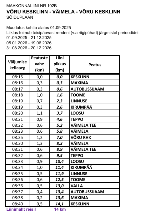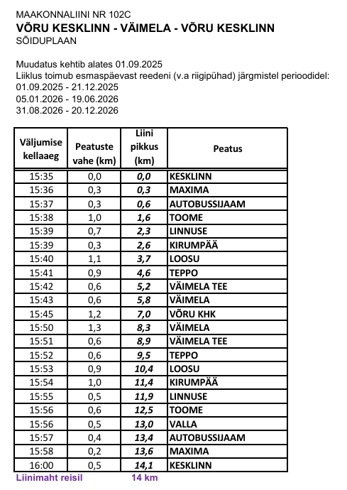 | 102B | Võru kesklinn – Väimela – Võru kesklinn | T-R 01.09.2025 – 21.12.2025, 05.01.2026 – 19.06.2026, 31.08.2026 – 20.12.2026 v.a riigipühad | [vaata] |