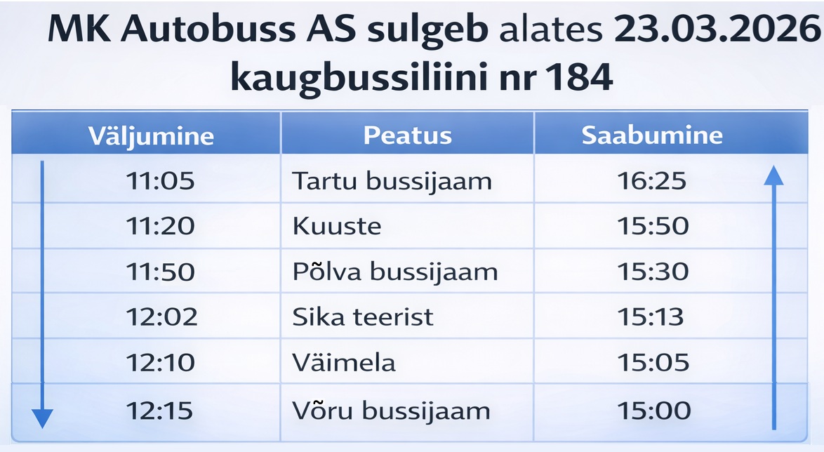 MK Autobuss AS teavitas, et lõpetab seni igapäevaselt käigus oleva kaugbussiliini 184 Tallinn – Tartu – Põlva – Võru teenindamise alates 23.03.2026.