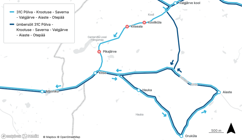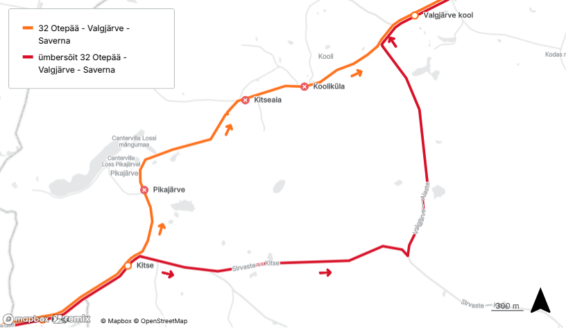 Seoses riigitee nr 18147 Saverna-Pilkuse teelõigul km-tel 7,7-9,3 teetruupide paigaldamisega 15. ja 16.04.2026. Ei läbi liinid 31C ja 32 Kooliküla, Kitseaia ja Pikajärve peatuseid.